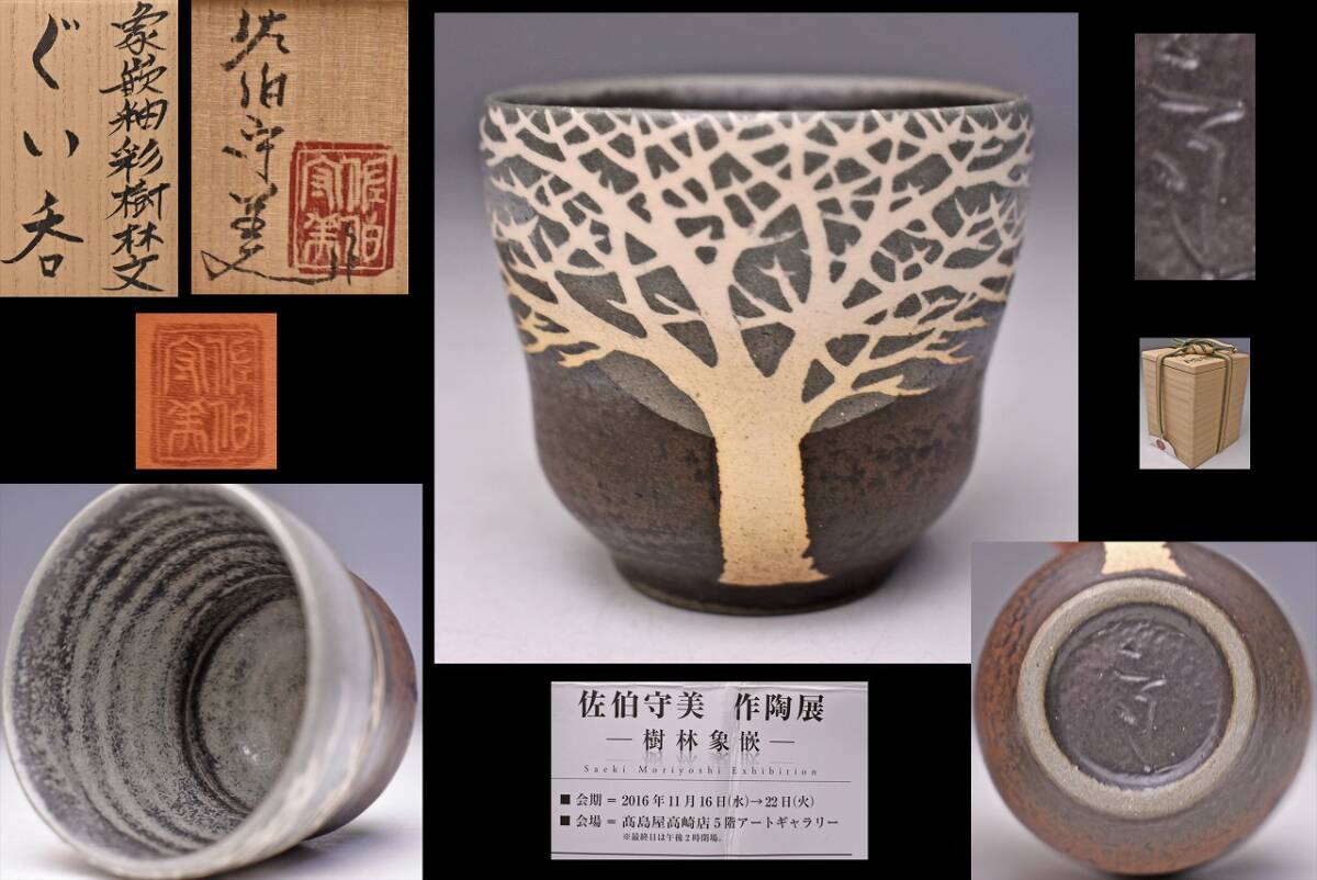 > 佐伯守美 ★ 象嵌釉彩樹林文 ぐい呑 ★ 共箱 共布 栞 ★ 上作 ★ 酒器 ★ 人気陶芸家 ★ 益子焼 ★独特な世界観が魅力的 ★ 酒盃 ★ 酒杯