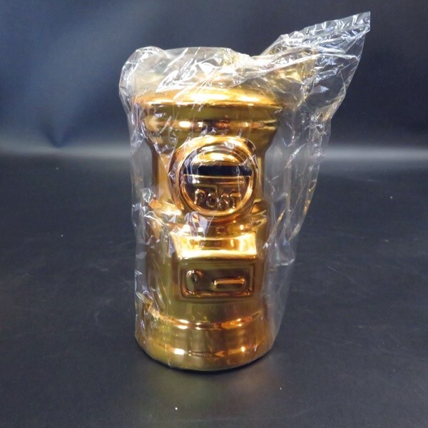 - U13 未開封金色貯金箱 約15㎝ 昭和レトロ 陶器製 ポスト型 バンク 置物 オブジェ 貴重 当時物 縁起物 ノベルティ