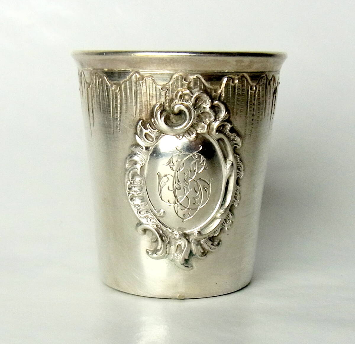 - フランス19世紀後期 純銀シルバー950 リキュールカップ モノグラム メダイヨン意匠 ロカイユ文 銀工房Veuve Ernest Compere