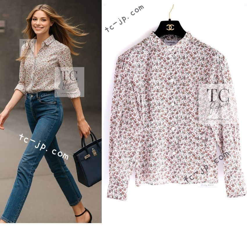 - シャネル ブラウス CHANEL 24PA 2024 ホワイト レッド CC ロゴ いっぱい 花柄 トップス さらり コットン 新品同様 34 紙タグ /予備布付