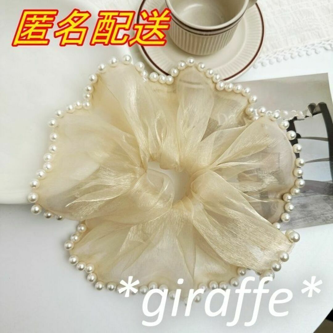 - E339 匿名配送 シュシュ パール 縁取 オフホワイト 大きめ 髪ゴム ヘアアクセサリー