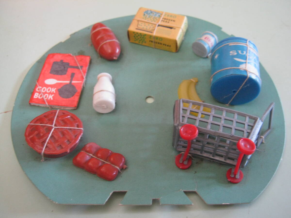 - 台紙に付いたミニチュア玩具10種(FROZEN PEAS箱・CRISCO缶・SUGARケース・買物カート・COOK BOOK・牛乳瓶・アップルパイなど食べ物4種)