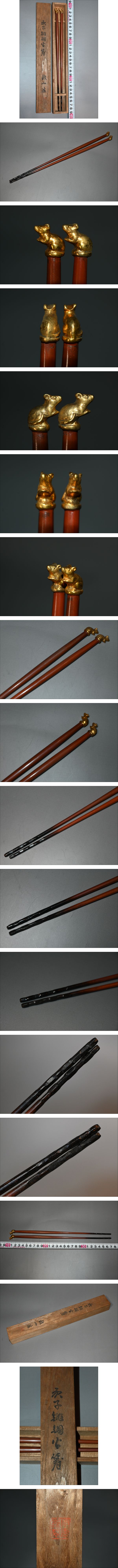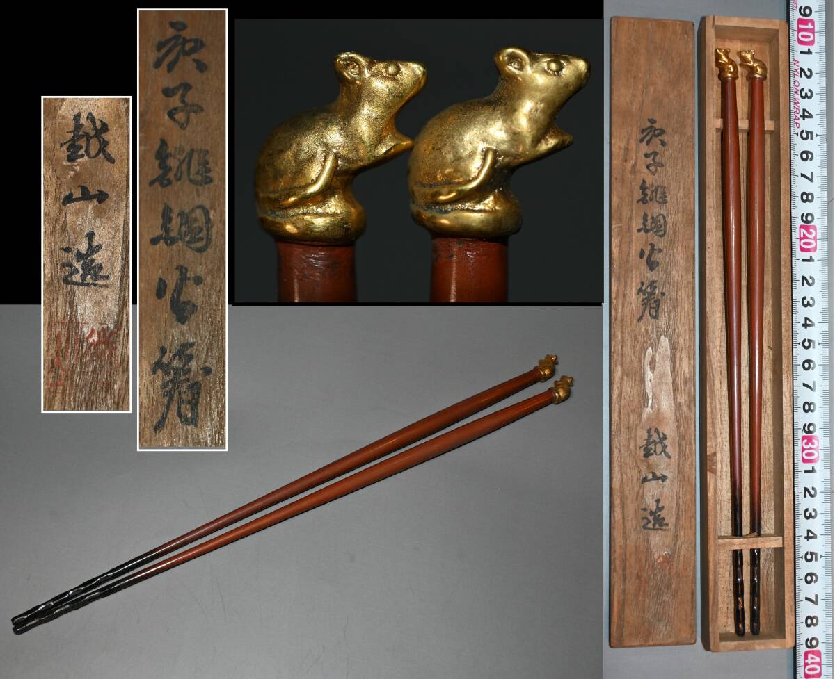 - 茶道具■越山造■ 庚子緋銅火箸 共箱 鋳銅 全長約27.2cm 炭道具 煎茶道具 飾火箸 炉 干支 鼠 ねずみ