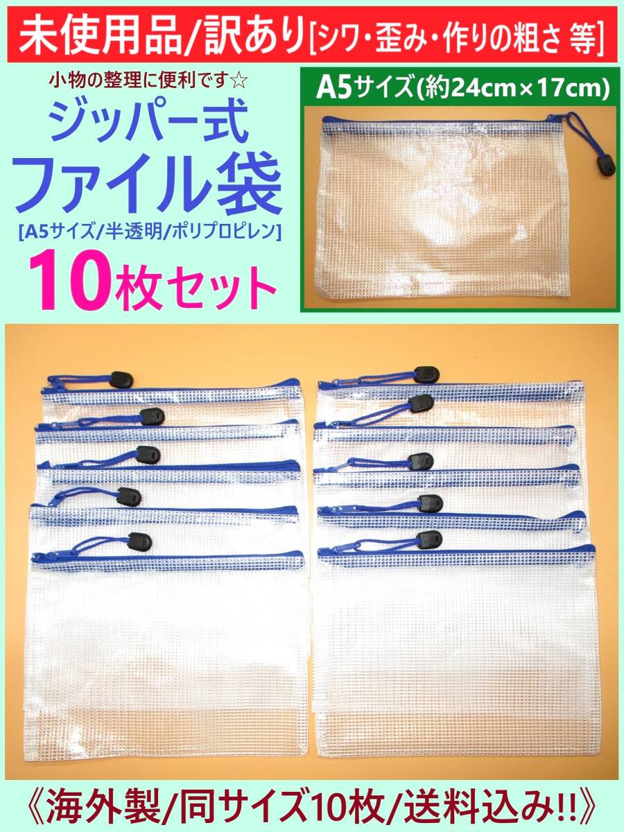 - 訳あり 未使用 ジッパー式 ファイル 袋 A5サイズ 10枚 D シワ 歪み キズ 半透明 白 メッシュ ファスナー ケース ポリプロピレン 海外製