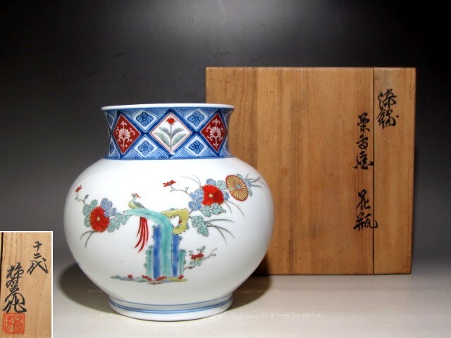 - 十二代酒井田柿右衛門 染錦花鳥画花瓶 美しい景色☆z700