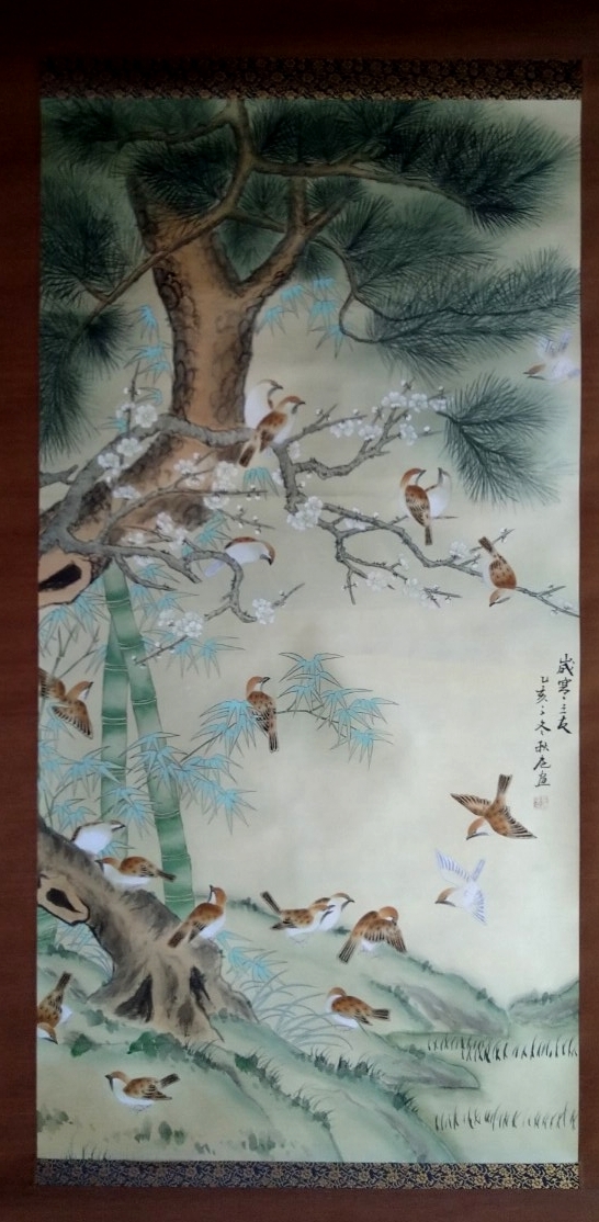 - 【貴重 お買得 美品】掛軸 松竹に雀 「厳寒三友」秋應臣 絹本 箱入 詳細未詳 作者未詳 真作か模写か不明