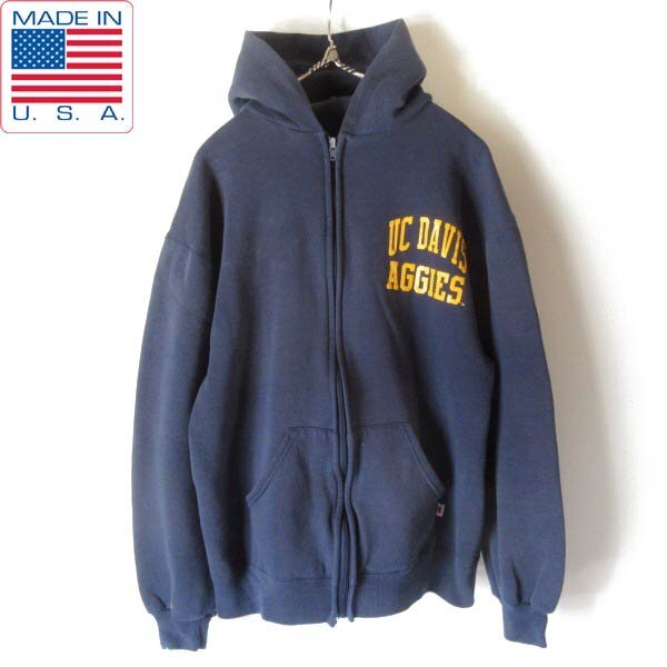 > 90s USA製 ラッセル フルジップ スウェット パーカー L カレッジ 紺系 トリコ刺繍タグ ジップ フーディ ビンテージ D150-13-0013ZVW