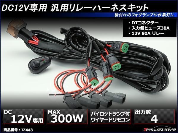 - スイッチ付 汎用リレーハーネス DTコネクター 防水コネクター 4出力 フォグ 作業灯 ワークライト 取付に 12V300Wまで IZ443