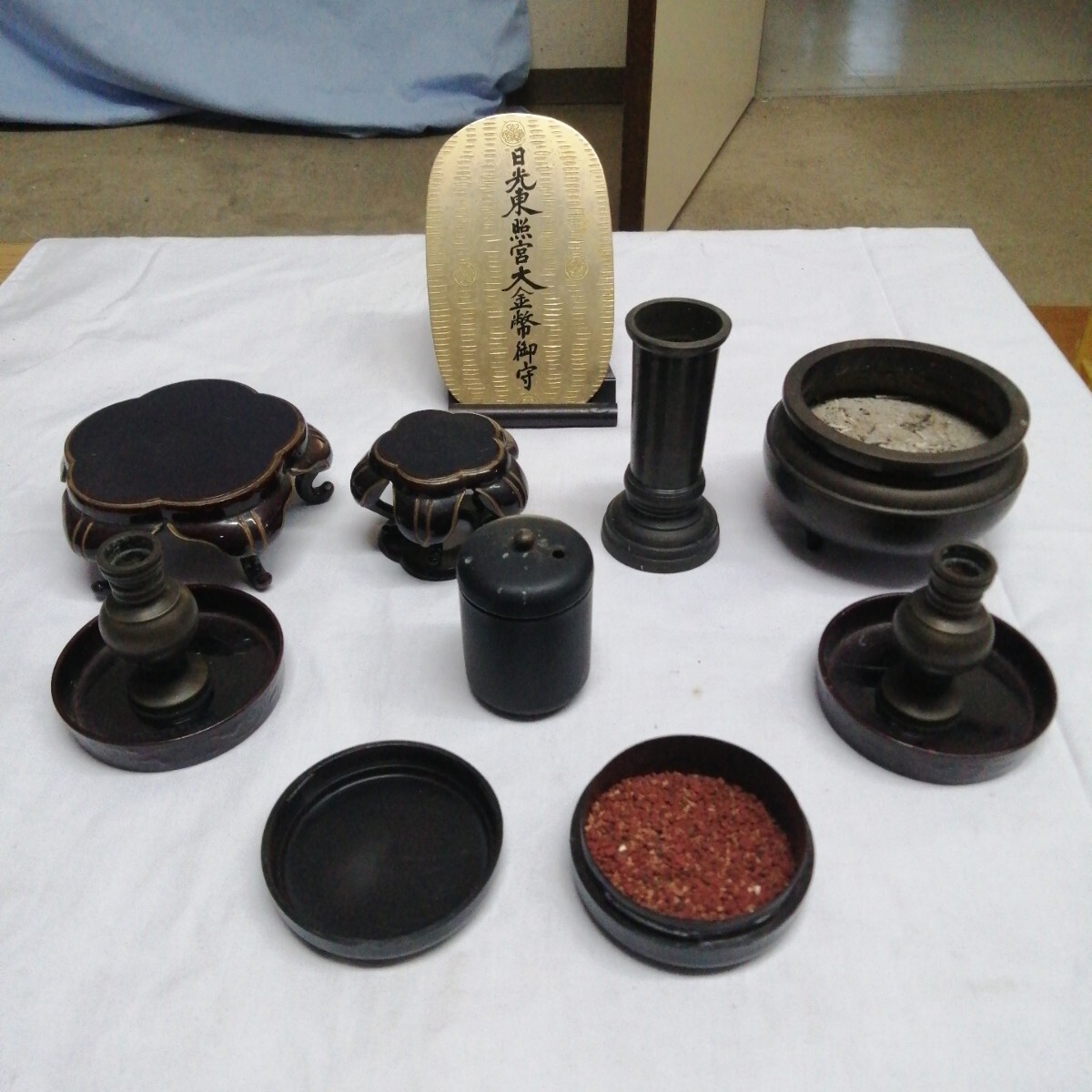 - 日光東照宮 大金幣御守 家内安全 仏具セット 真鍮 木製台 お線香立て マッチ入れ 花立て