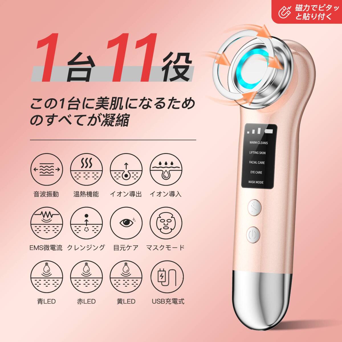 > 1台11役 音波振動美顔器 多機能 ems 温熱ケア イオン導出導入 3色光エステ 5つモード 3段階レベル USB充電式 コットン付属 日本語説明書