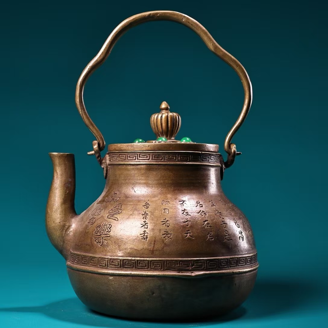 - 茶壺 時代旧蔵 清時代 古銅刻知足常楽急須 銅製 仏教古美術 細密細工 廃寺旧蔵 廃寺買出品 古置物 中国古玩 MS6-030430