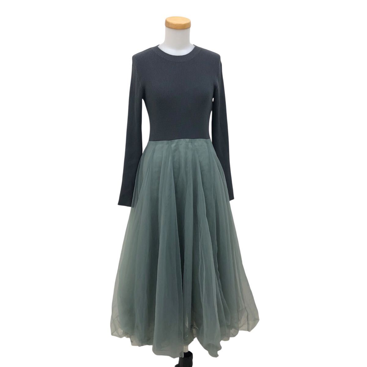 > 9m648-21 2020年製 snidel スナイデル ニットxチュールコンビワンピース 長袖 リブ ニット ドッキング ロング ワンピース グリーン系 One