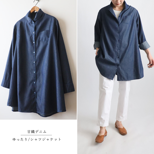 - 秋支度 甘織デニム 丸襟 シャツ ジャケット 胸ポケット付 ゆったり 着丈長め 長袖 羽織りシンプルH83
