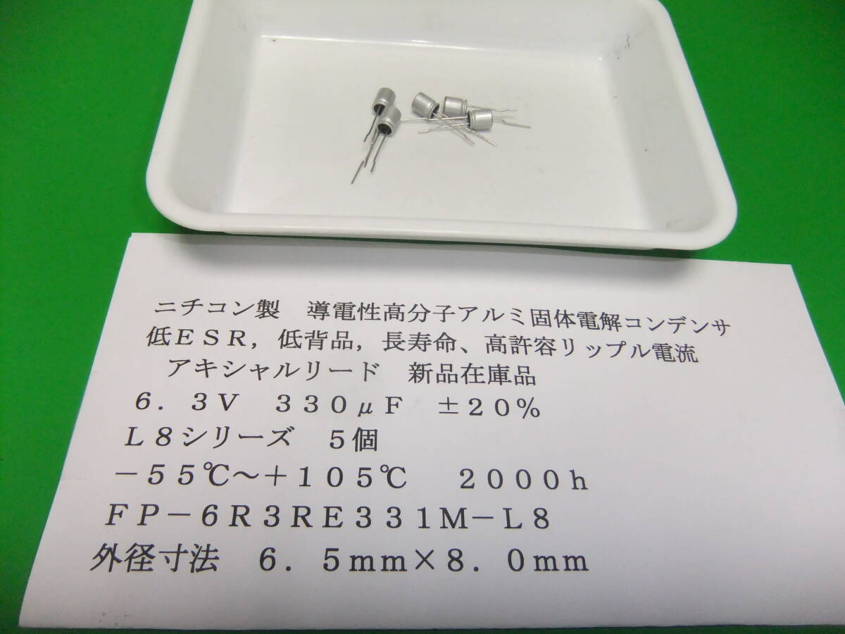 - ニチコン製 貴重品・導電性高分子アルミ固体電解コンデンサ 6.3V 330μF L8シリーズ 5個 新品在庫品 B