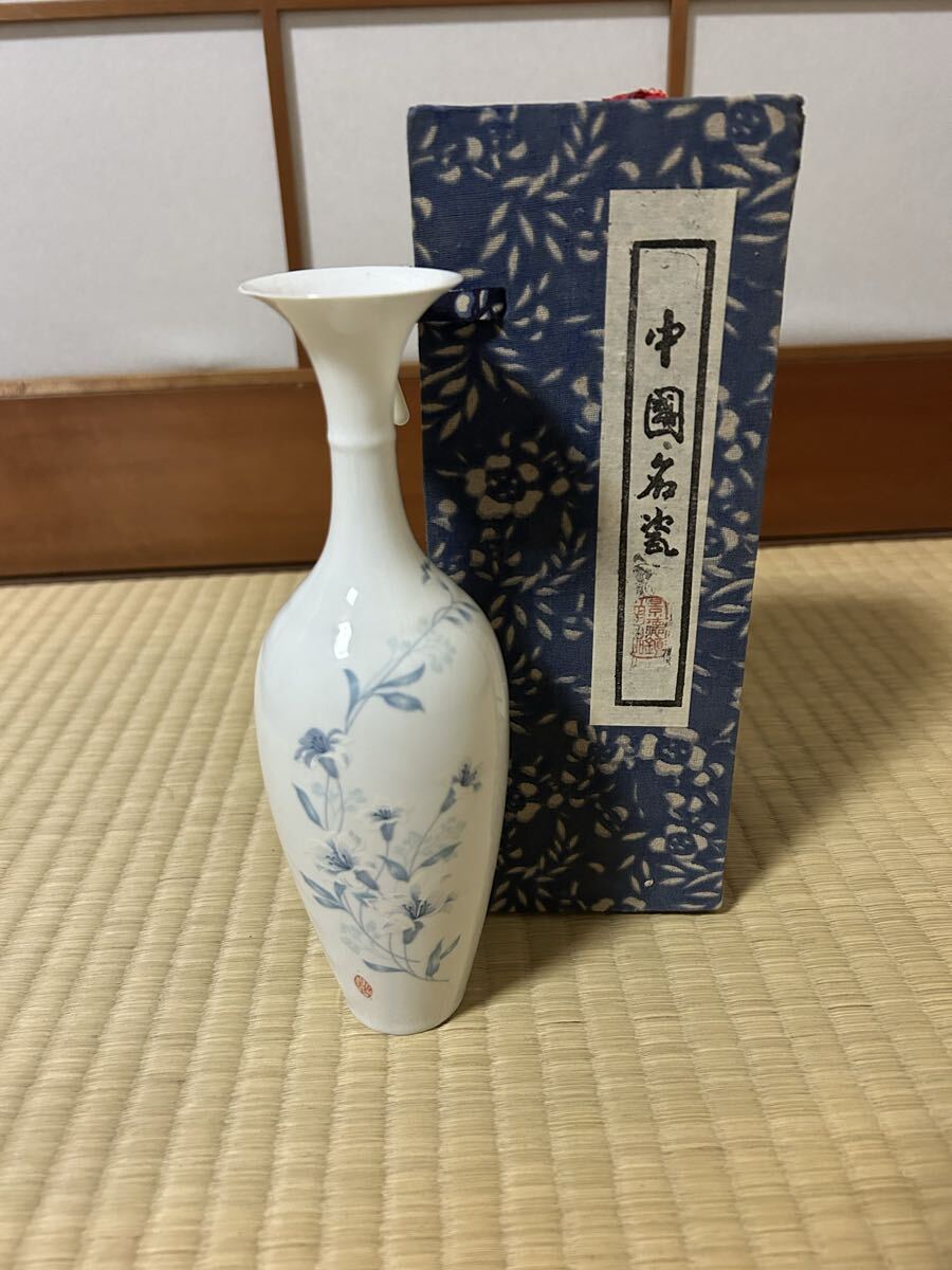 - 伝統工芸 工芸品 工芸美術 中国 EMBA 景徳鎮製 花瓶 一輪挿し 中国美術 花紋 在銘 薄胎 *元箱付き フラワーベース 花器