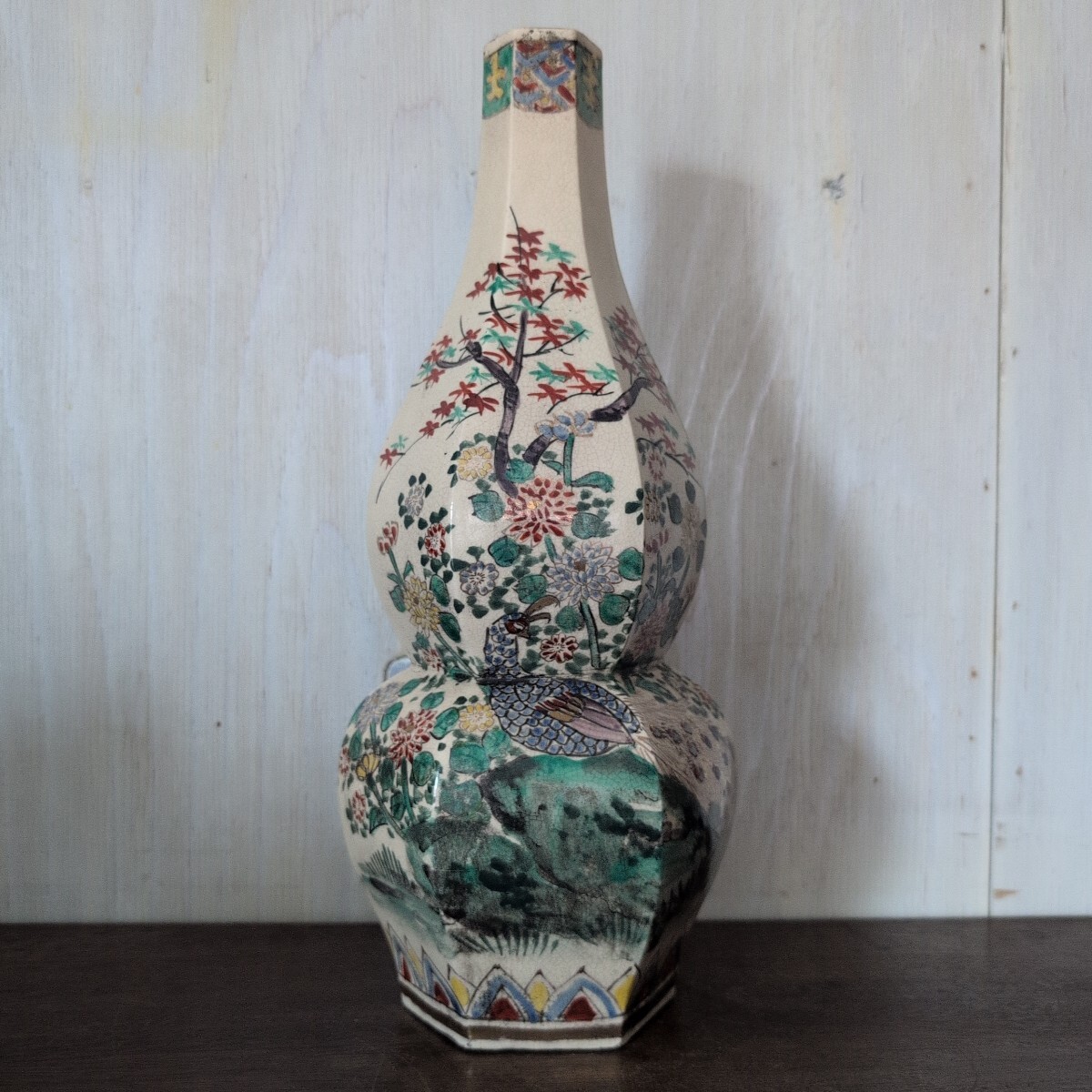- 薩摩焼 沈寿官 造 金彩 色絵 孔雀 紅葉 菊 花鳥図 瓢箪形 花瓶 花器 花入 古美術 アンティーク