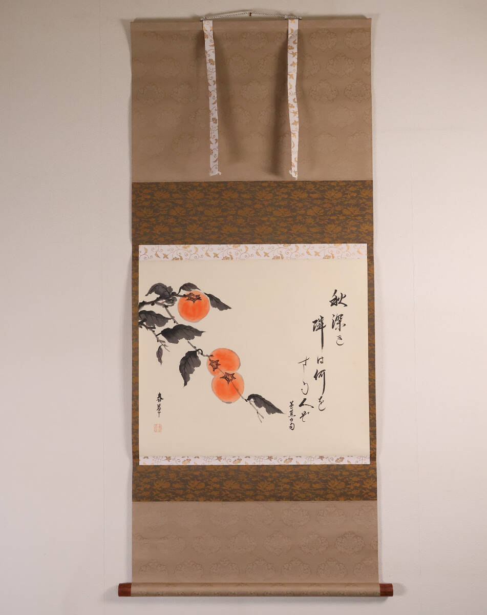 - 【真作】日本画 俳画 松尾芭蕉の句 柿図 松沢春草画 紙本 掛け軸 彩色 秋深き隣は何をする人ぞ MA835