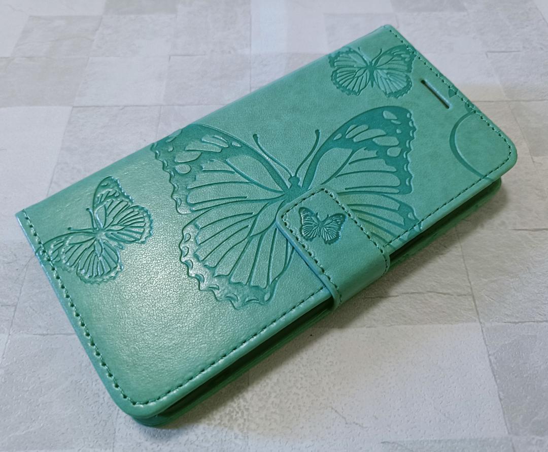 > iPhone15 用 スマホケース 手帳型 蝶柄 バタフライ グリーン