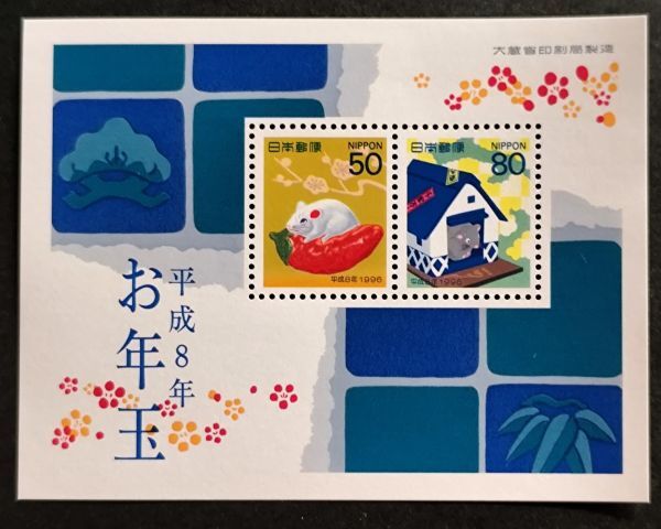 - [25090602] 年賀切手【お年玉小型シート 平成8年】子「唐辛子乗りねずみ 堤人形・米倉ねずみ 薩摩首人形」41+62円 1996年発行 美品