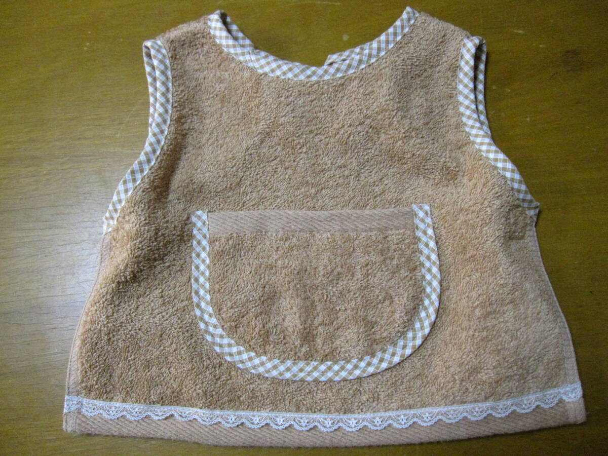 - 手作り ベビーエプロン タオル地 無地 ポケット レース 子供 兼用 男女 ハンドメイド 秋 冬 赤ちゃん 男児 女児 可愛い 格安 濃いベージュ