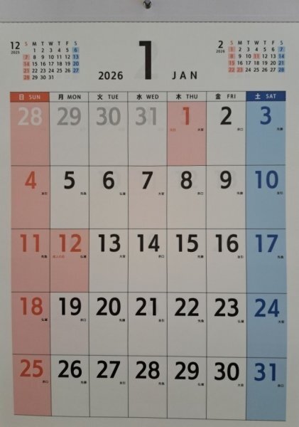 - 【送料無料:1冊:3色 カラー カレンダー:A4:30x21cm】★カラフル 大文字:2026年★令和8年:暦・こよみ