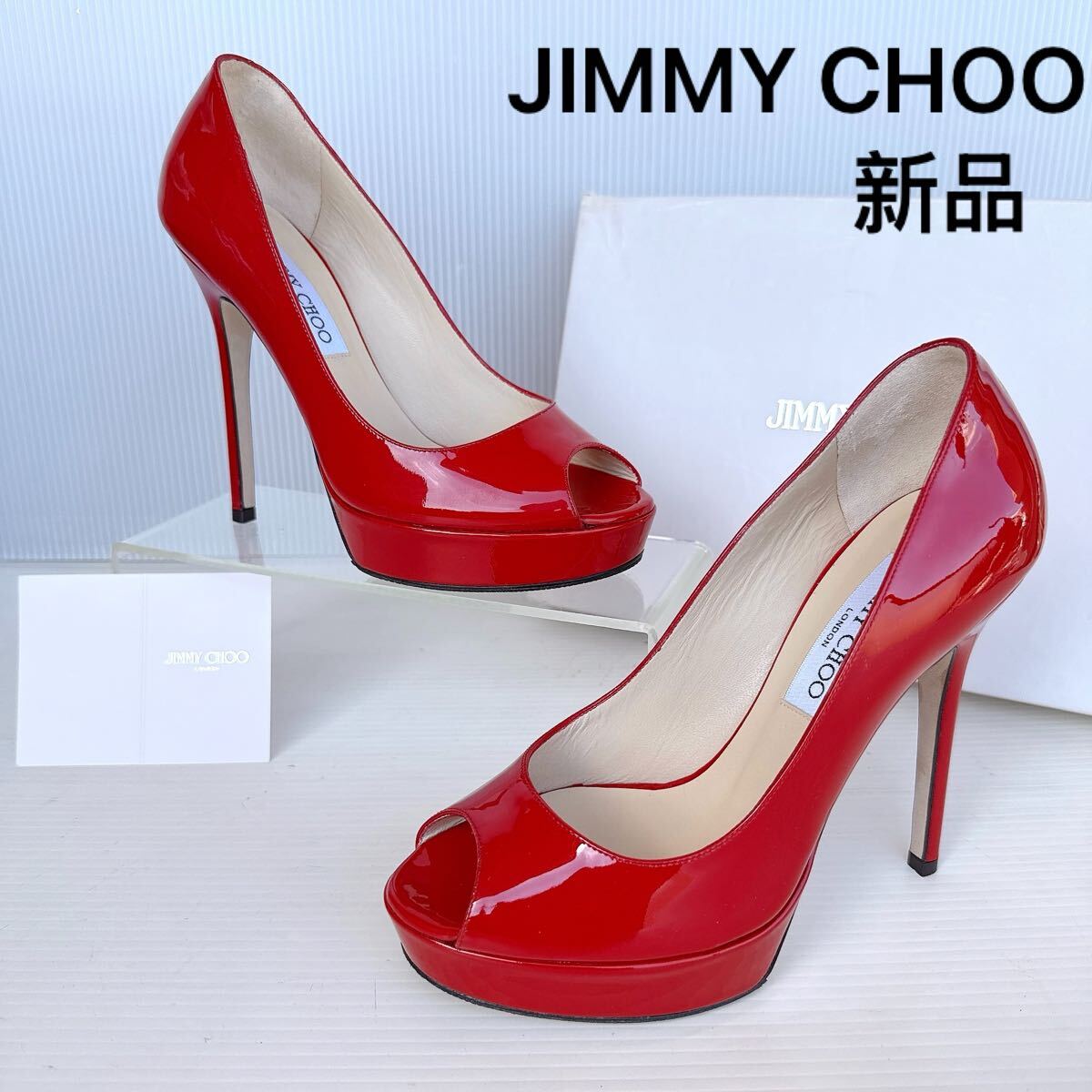 - JIMMY CHOO ジミーチュウ オープントゥ 厚底 ハイヒール パンプス サンダル シューズ 靴 赤 レーディス 36.5 新品 エナメルレザー