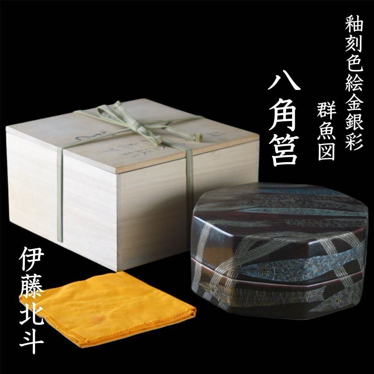 > 伊藤北斗 最上位作 釉刻色絵金銀彩 群魚図 八角筥 共布 共箱 師 藤本能道 I123
