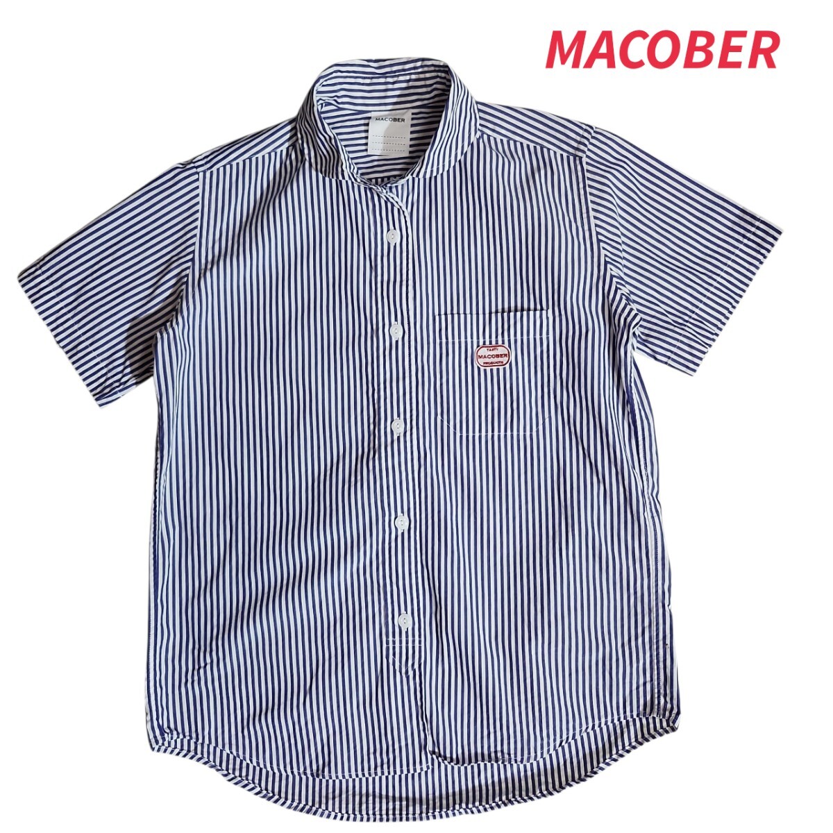 - MACOBER 丸襟 ストライプ半袖シャツ ワッペン 日本製 ネイビー&白 68967