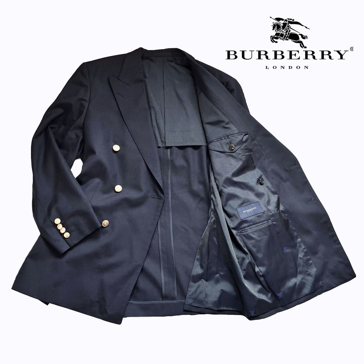 > 美品 BURBERRY LONDON バーバリー テーラードジャケット ネイビー ダブル 金ボタン 紺ブレザー ウール モヘヤ 背抜き メンズ L