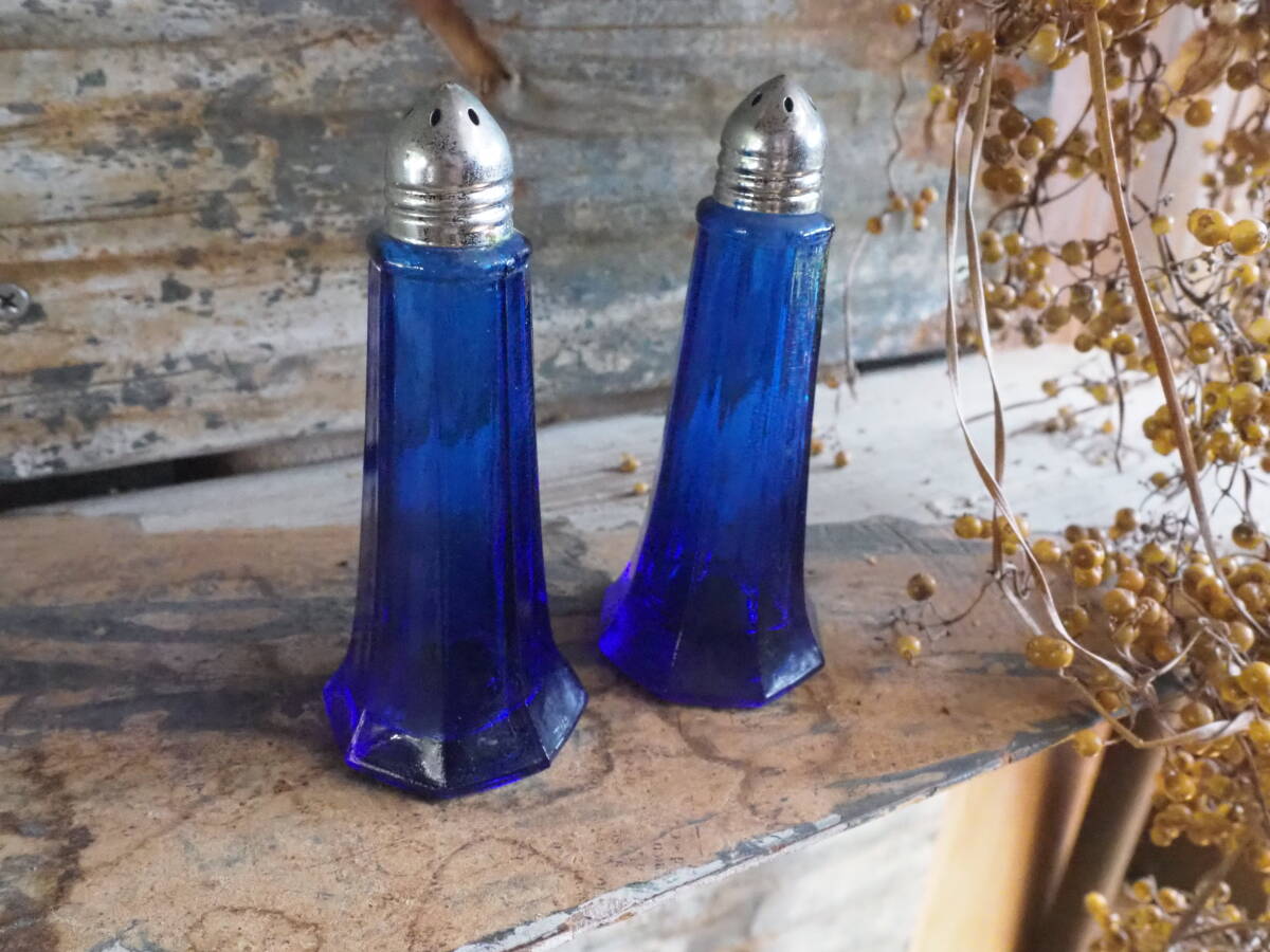 - 【フランス蚤の市ソルト&ペッパー】ブルーガラスキッチン古道具アンティークインテリアカフェ塩コショウ店舗什器バーレストラン