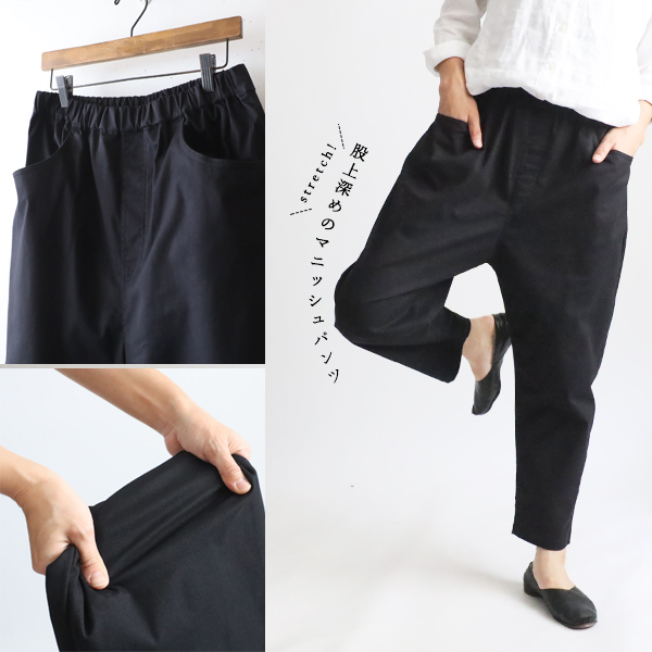 - 秋のパンツ祭り 93cm ストレッチ伸縮コットンチノ生地 マニッシュ テーパード パンツ ペグ チノパン ブラック 黒G38