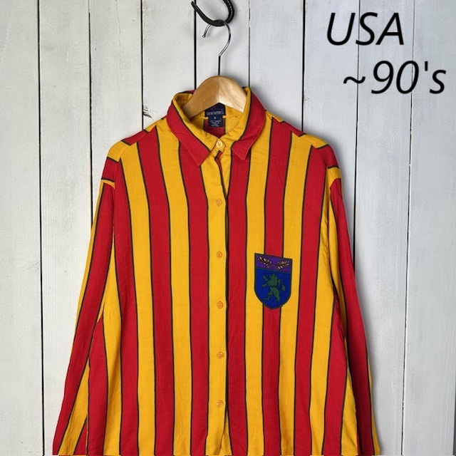 > sh●A05 USA古着 90s 太ストライプ レーヨンシャツ ブラウス 8 赤×オレンジ オールド ヴィンテージ M~L 長袖 やや薄手 ゲームシャツ風