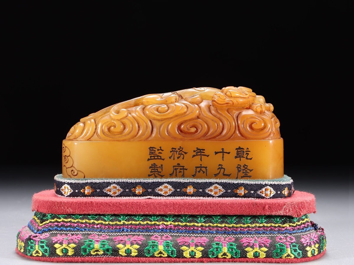 - 「清 乾隆十九年内務府監製 老寿山石 田黄石彫り 祥雲魑龍紋鎮紙」極細工 擺件 古賞物 中国古美術 旧蔵出