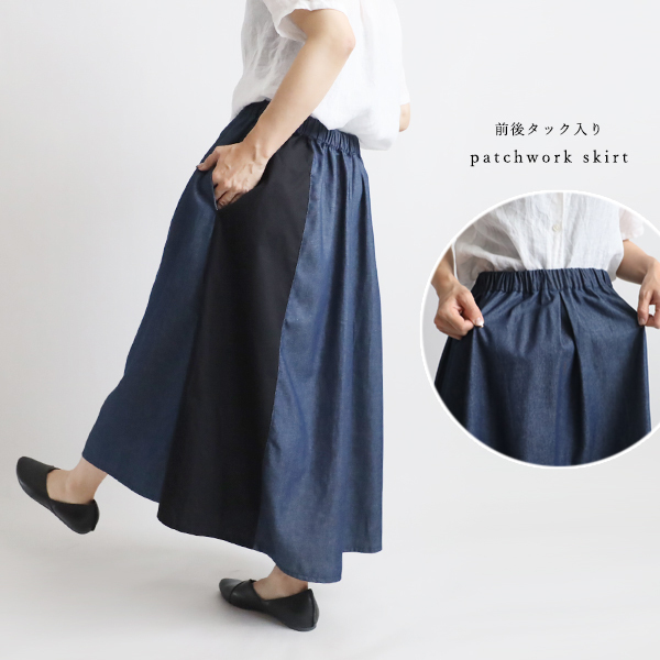 - 送料無料 新作 78cm 愉快なスカート パッチワーク 前後ウエスト内タック入 ゴムギャザー スカート Y54F