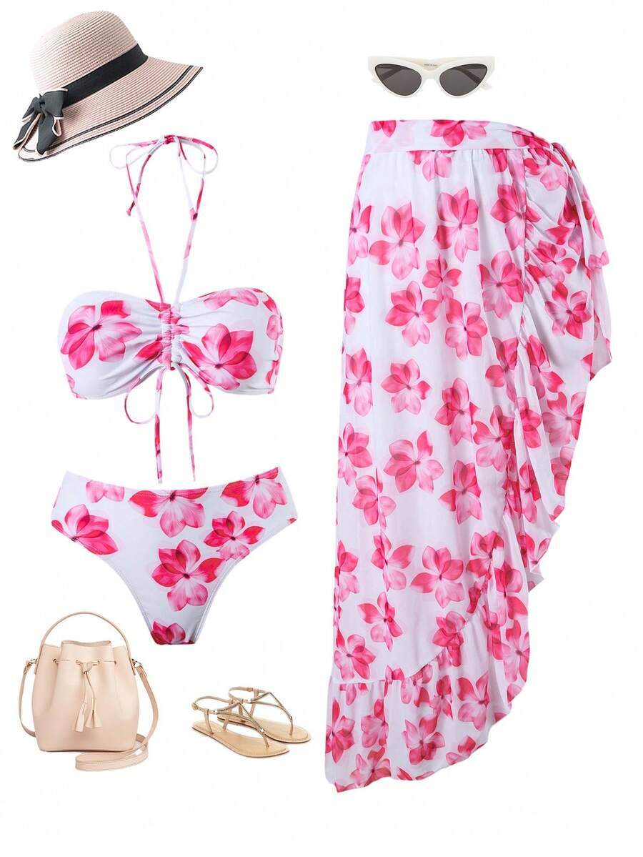 - レディース 水着 ビキニセット 女性用プリントビキニセット 3点 ホルターネック トップ、クラシックフリルカバーアップ&ボトム、バ