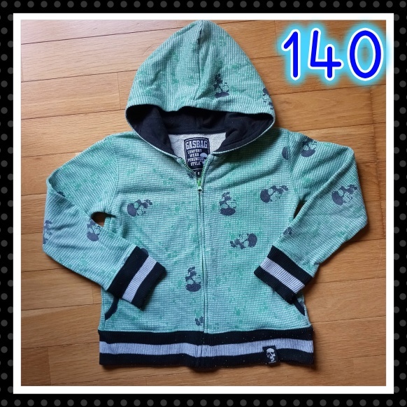 > 140 8 GASBAG ガスバッグ パーカー トレーナー 長袖 総柄 髑髏 ドクロ スカル ガイコツ 緑 スウェット フード付き フーディ 部屋着 美品
