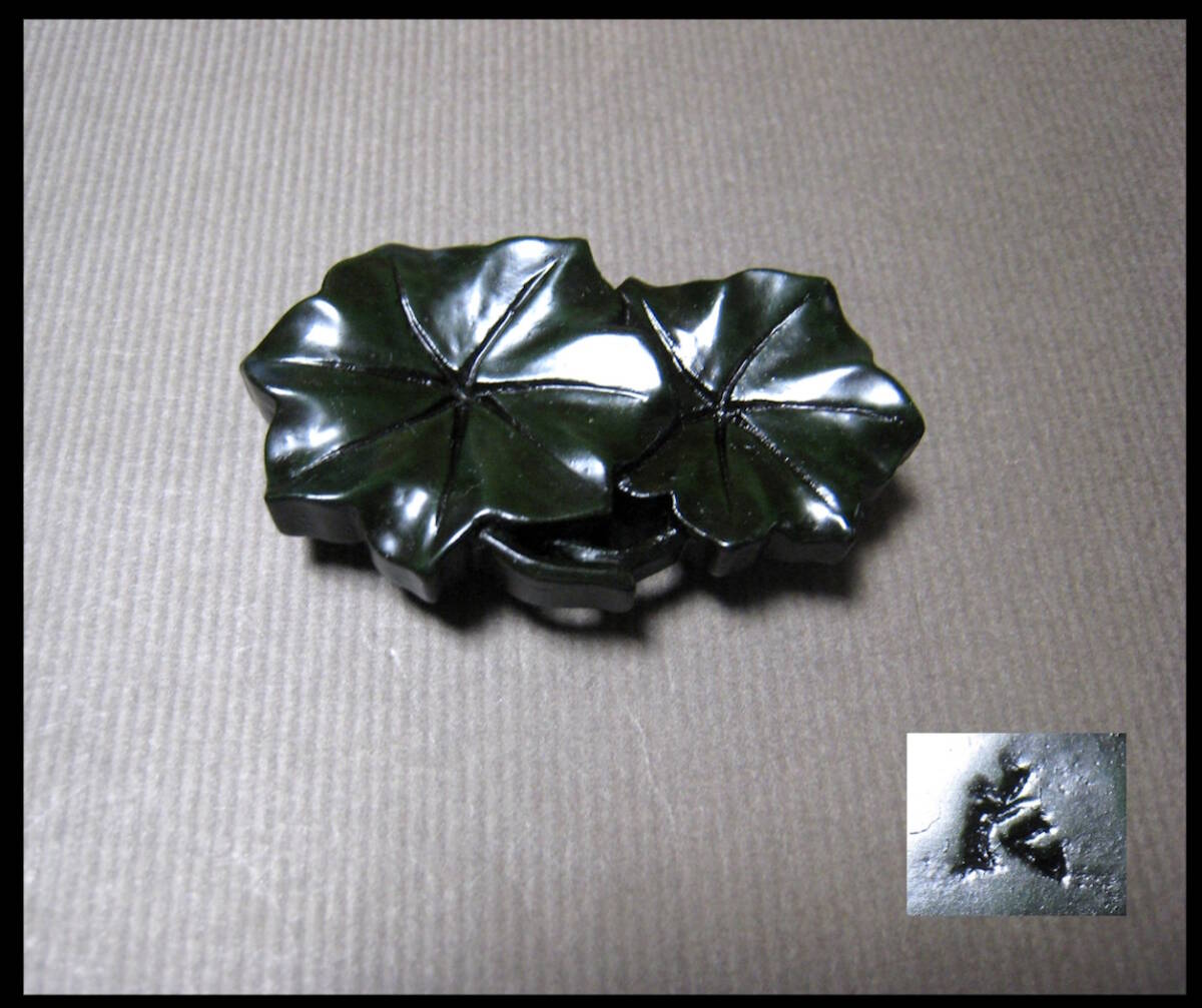 - 葉 重ね 深緑色彩色 作家物 銘有 帯留 着物 帯飾り 和装小物 大振り 6cm 木彫?
