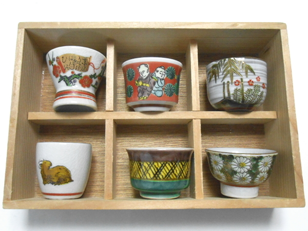 - 青九谷 九谷焼★邦泉 祥花 仙守 鶴三等 盃 羊文様 子供文様 花詰文様等 6種