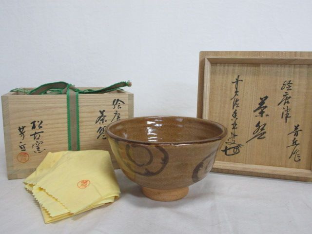 - 雉坂★【 万古焼 絵唐津茶碗 鼓 松古窯 佐久間芳丘 共箱 大橋香林 書付 共布 】茶道具・抹茶碗