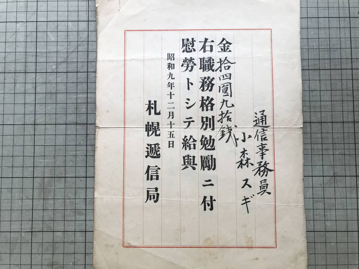 - 「札幌逓信局及び札幌豊平郵便局から通信事務員小森スギ宛 慰労金等給与表彰状 9枚 昭和九年から十三年まで」1934‐1938年 ※辞令 00456