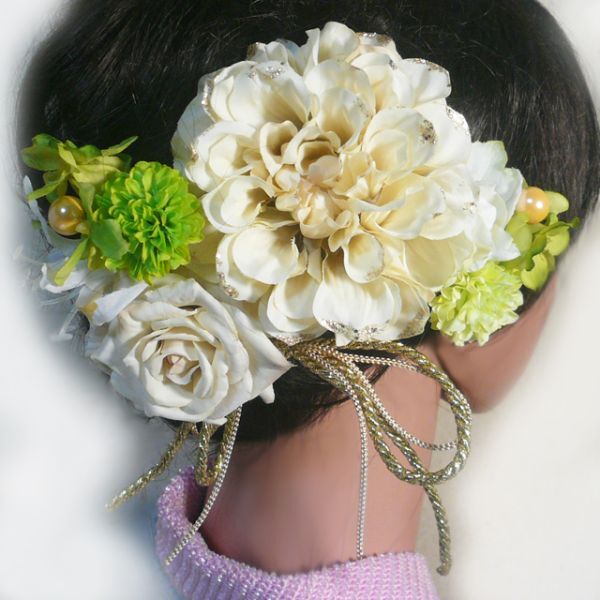 - 花 髪飾り ラメダリアbeと小花 淡茶白緑 結婚式 成人式 卒業式 かんざし