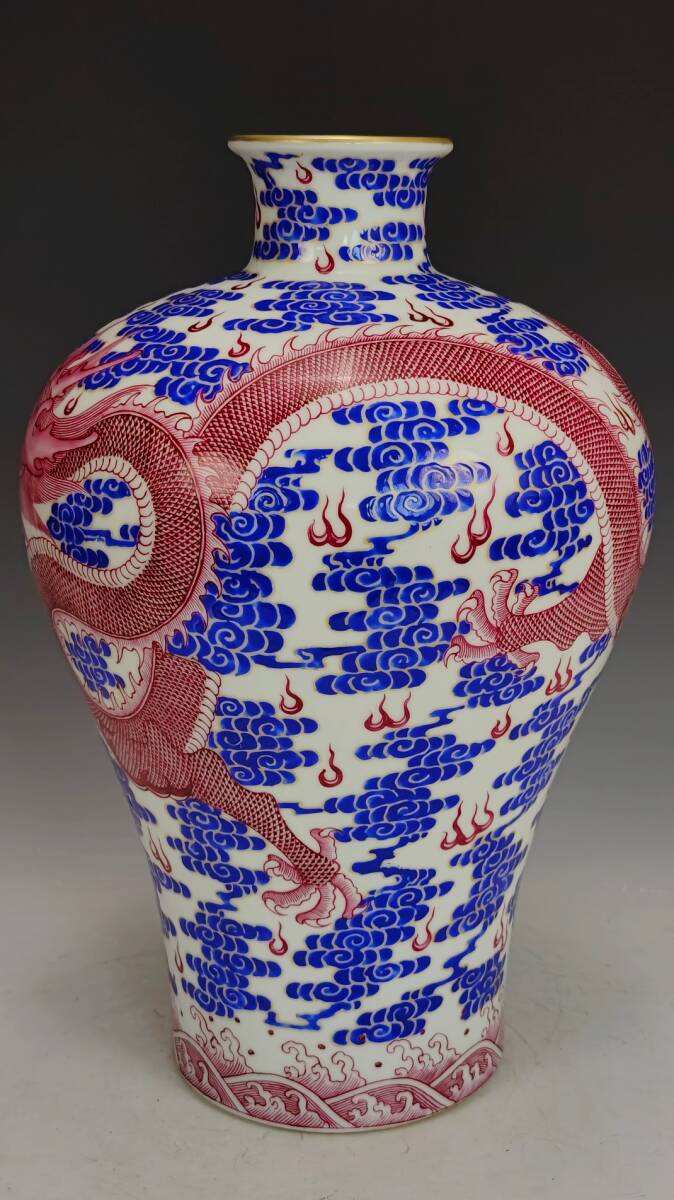 > 多宝閣 ■208840 中国磁器 中国骨董【乾隆官窯青白瑪瑙赤龍文梅花瓶】工芸品 施釉陶 陶芸 置物 收藏品 孤品