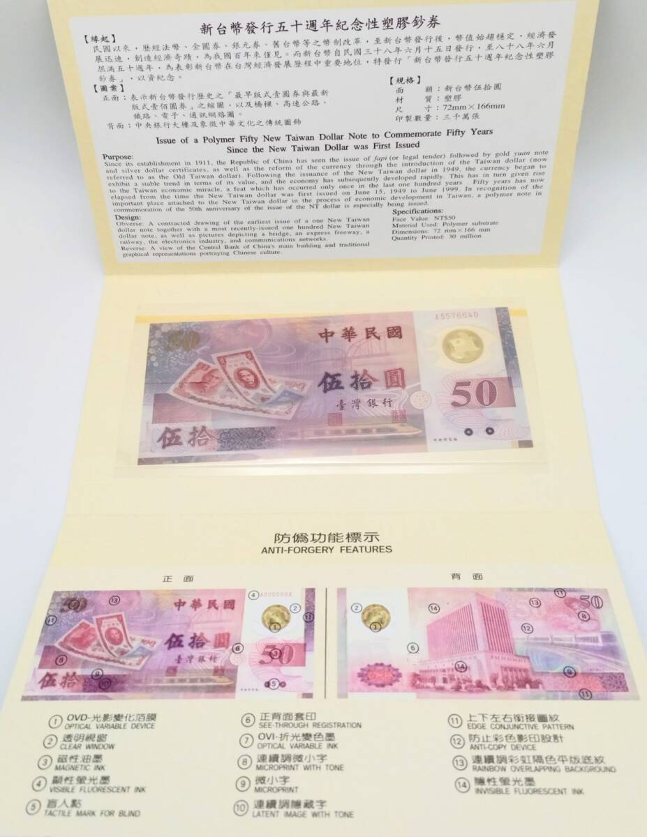 - FK2239【希少・超レア】未使用 台湾ドル 発行50周年記念 ピン札 ポリマー 冊子付き 中華民国 台湾銀行 伍拾圓 50圓 海外紙幣 外国紙幣