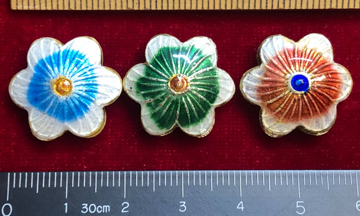> ¶!¶ 有線七宝焼ワールド - 3色(3個)の六弁花型ペンダント ¶!¶ 約厚8㎜×20㎜ 金線に3色釉六弁花 手作 手芸 工芸 インテリア ペンダント
