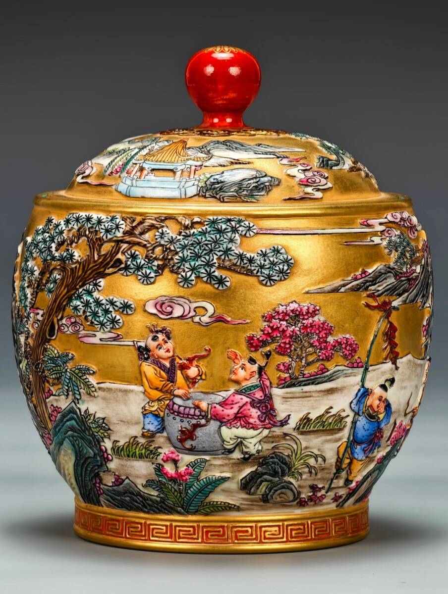 > 9+GV8611「東洋美術」 中国骨董 人間国宝 磁器製品【「遊ぶ子供たちと春節」模様の蓋付き瓶】 旧物 孤品 珍品 陶磁器 収蔵価値が高い
