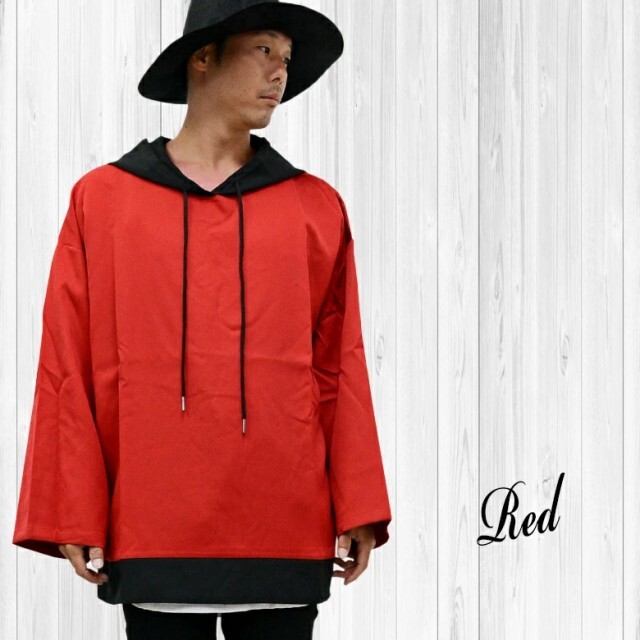 - 1円スタート ビッグシルエット 長袖配色 プルオーバーパーカー 0308vr パーカー メンズ 新品 レッド L