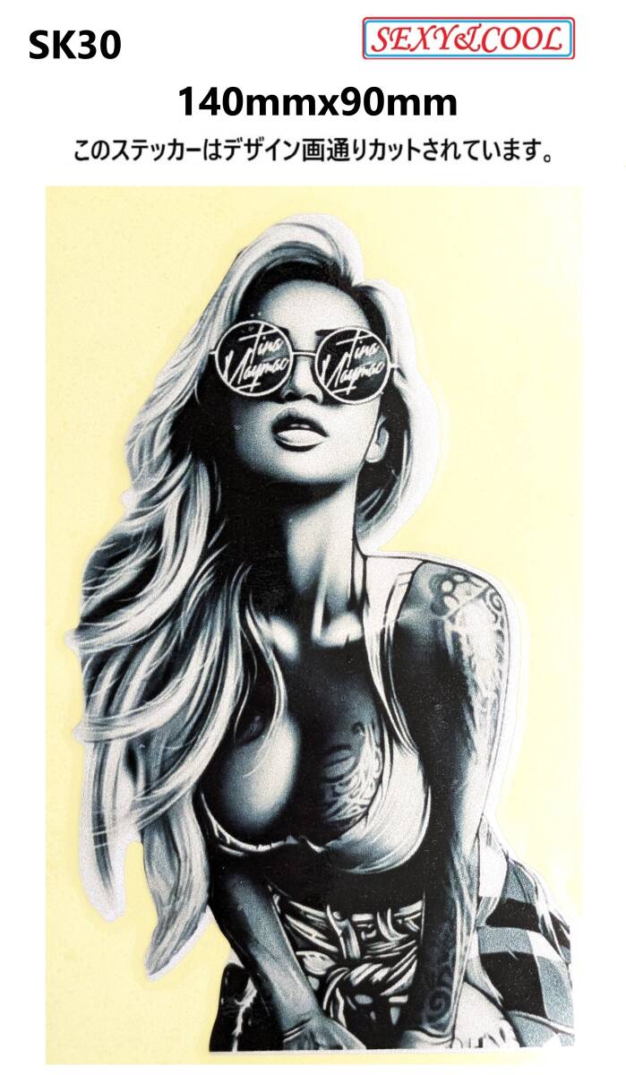 - SK30-02 特価 キラキラ 美人 モノクロ クール タトゥー 刺青 サングラス ワイルド SEXY セクシーステッカー レトロ ギター ボード デカール