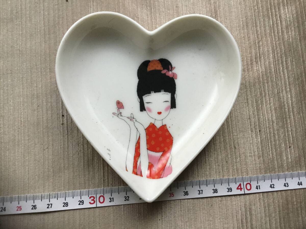 - ハート型焼きもの 飾り皿の表と裏に作者:「林 静一」銘があります たいへん可愛らしい 赤い着物は鮮明に 存在感か溢れる です
