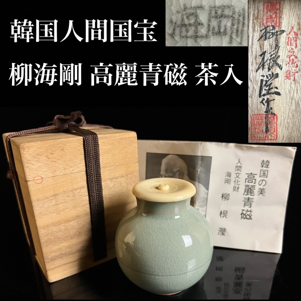 > 韓国人間国宝 柳海剛(柳根瀅) 青磁 茶入 7.5cm 共箱 栞付 茶道具 煎茶道具 高麗 李朝 朝鮮美術 唐物骨董[麌]