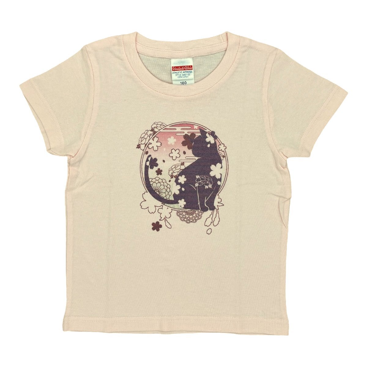 > [江戸てん]1点のみ 子供Tシャツ 前面に「花猫(小)」(背面は無地) 綿100% 捺染プリント キッズ ピンク 100